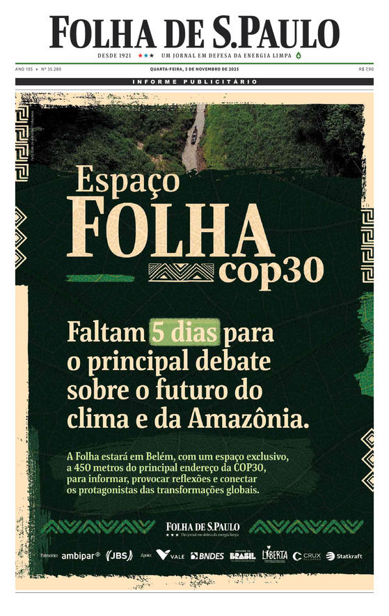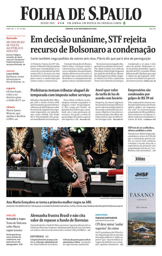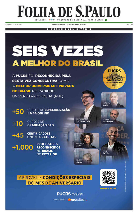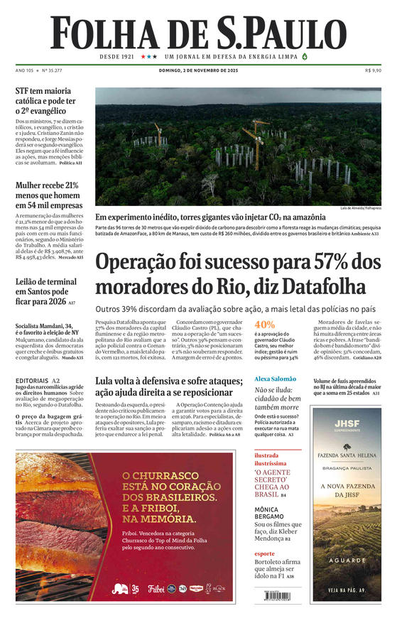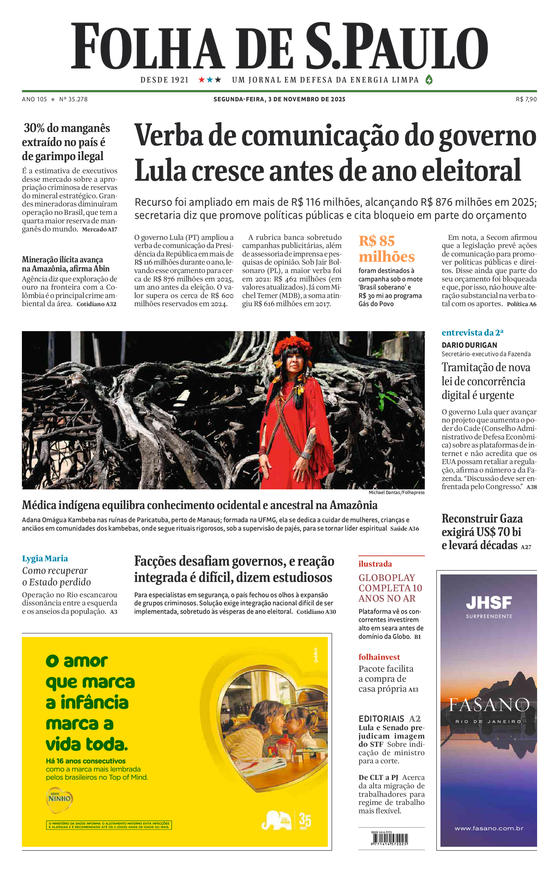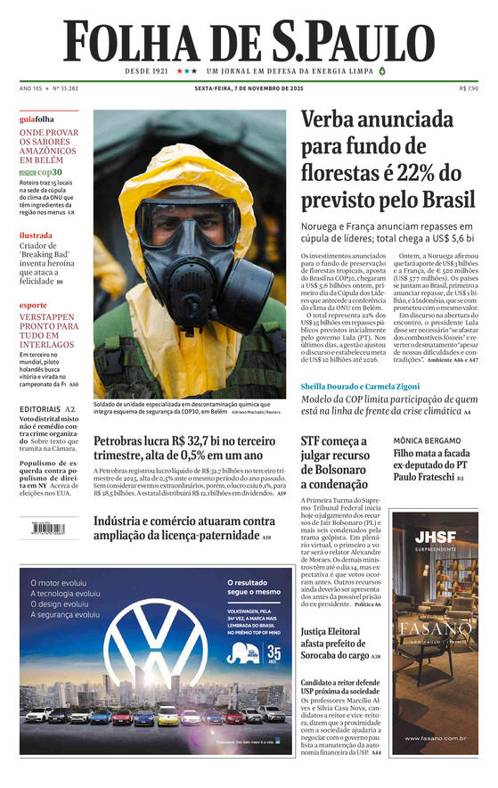 hoje, 10.nov.2025 Folha de S.Paulo Ano 105 - N° 35.313 seções Sobrecapa Capa Opinião Política Folhainvest Mercado Mundo Cotidiano Ambiente Saúde Esporte Folhacorrida Ilustrada Ciência Caderno Especial