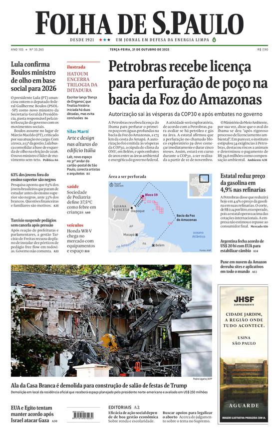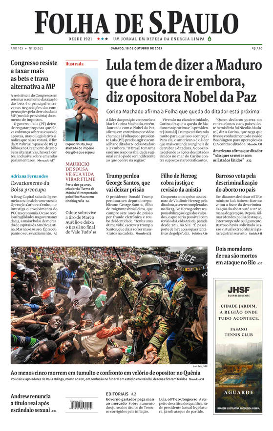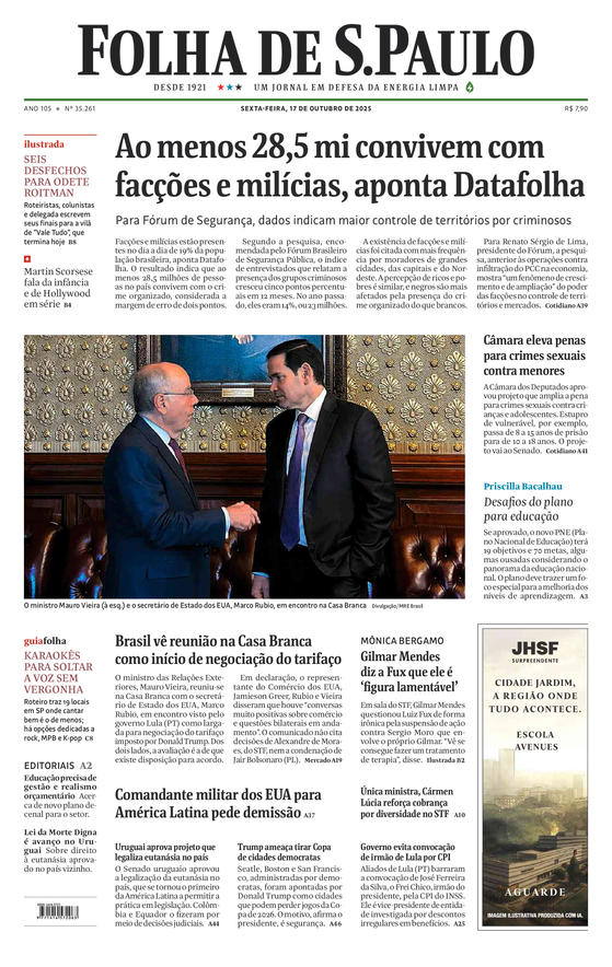 hoje, 27.out.2025 Folha de S.Paulo Ano 105 - N° 35.299 seções Capa Opinião Política Folhainvest Mercado Mundo Cotidiano Ambiente Saúde Esporte Folhacorrida Ilustrada Ciência