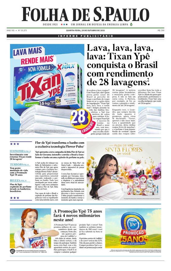 hoje, 29.out.2025 Folha de S.Paulo Ano 105 - N° 35.301 seções Sobrecapa Capa Opinião Política Mercado Mundo Cotidiano Ambiente Saúde Ciência Esporte Folhacorrida Ilustrada Equilíbrio Revista Top Of Mind