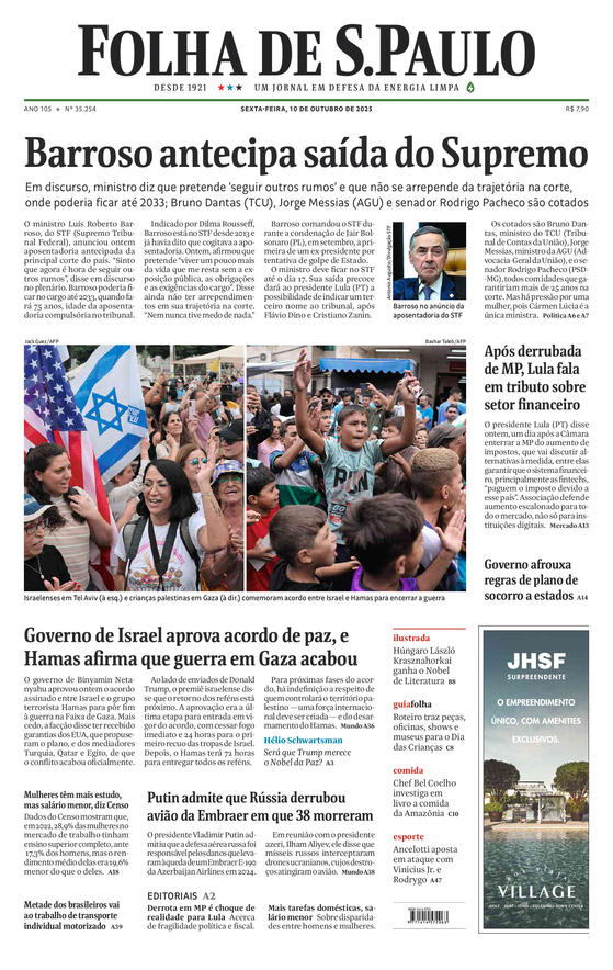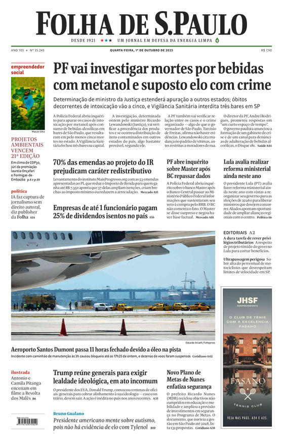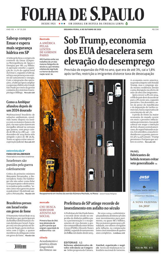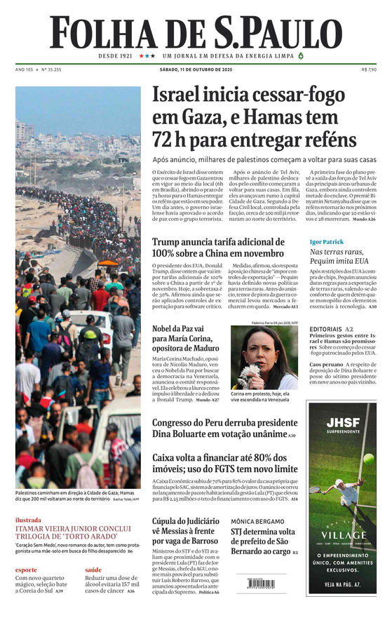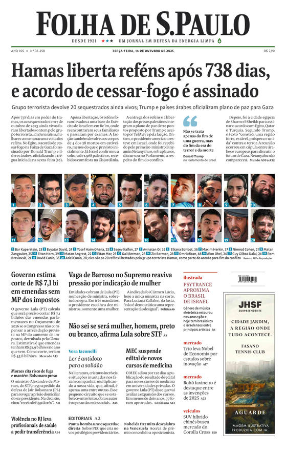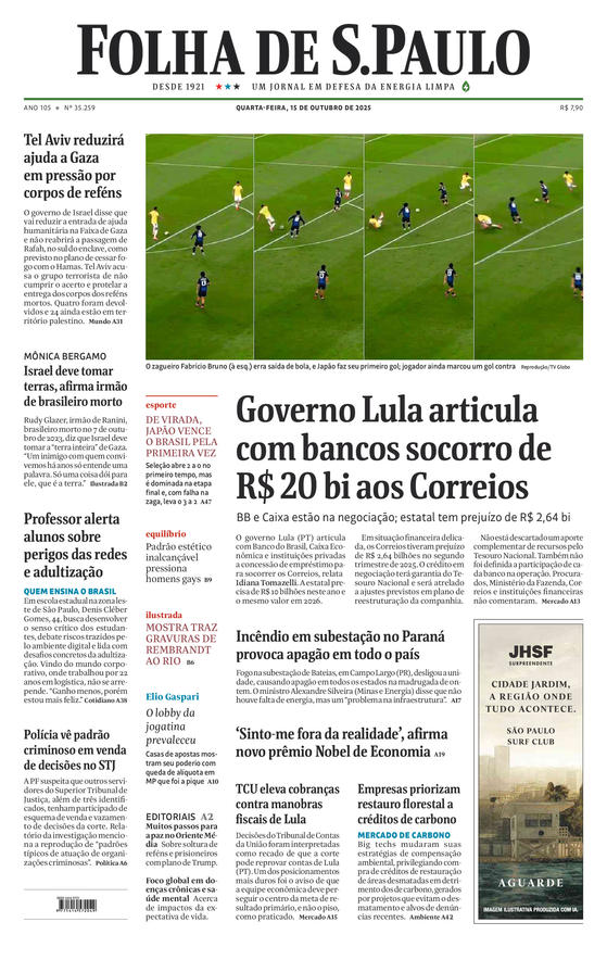 hoje, 15.out.2025 Folha de S.Paulo Ano 105 - N° 35.287 seções Capa Opinião Política Mercado Mundo Cotidiano Ambiente Saúde Ciência Esporte Folhacorrida Ilustrada Equilíbrio