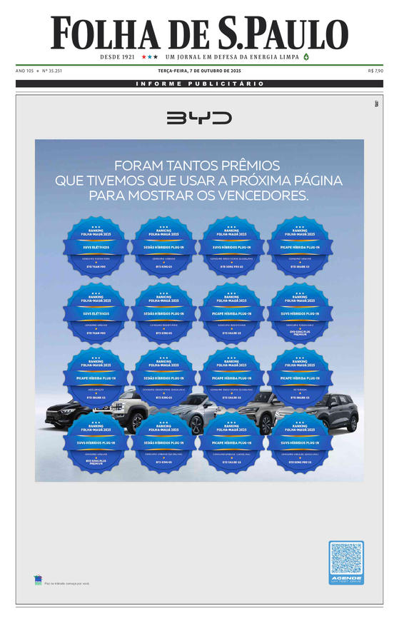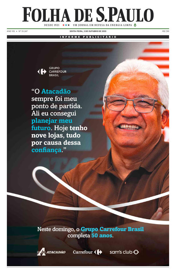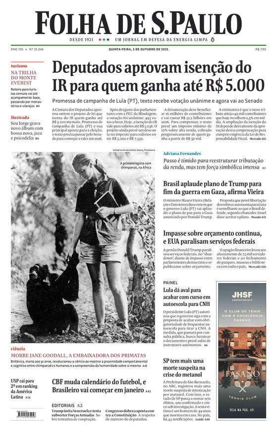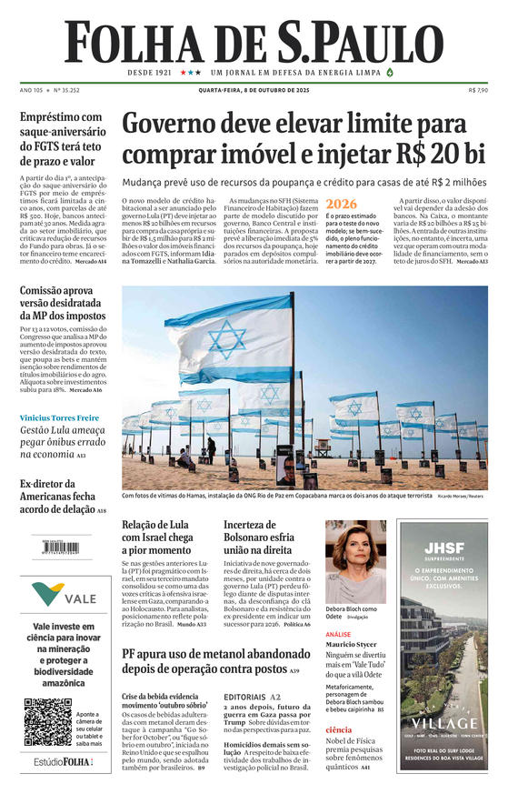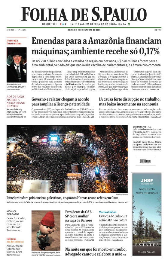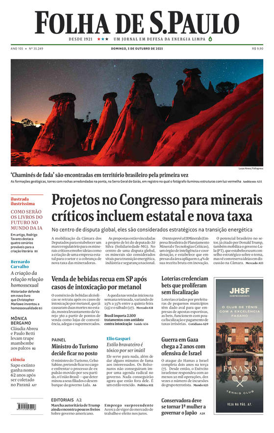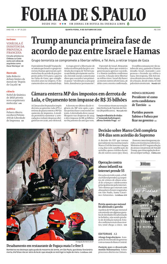 hoje, 15.out.2025 Folha de S.Paulo Ano 105 - N° 35.287 seções Capa Opinião Política Mercado Mundo Cotidiano Ambiente Saúde Ciência Esporte Folhacorrida Ilustrada Equilíbrio